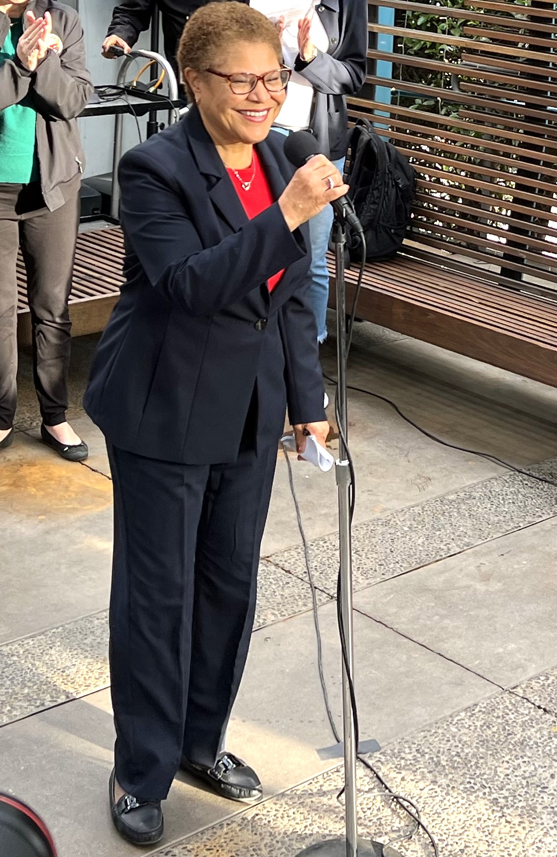 “This is a great day in Venice, California,” Bass said. “There are 40,000 unhoused on our streets and five of those people don’t wake up every day.