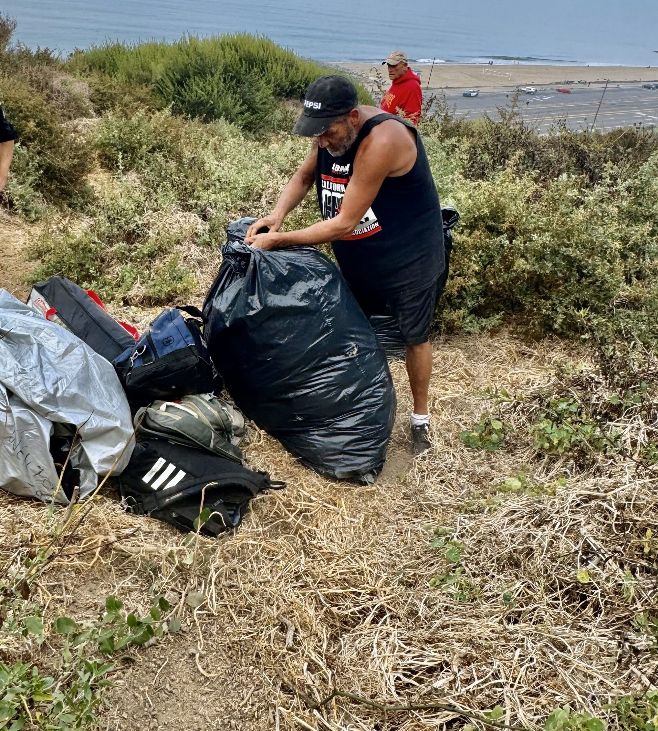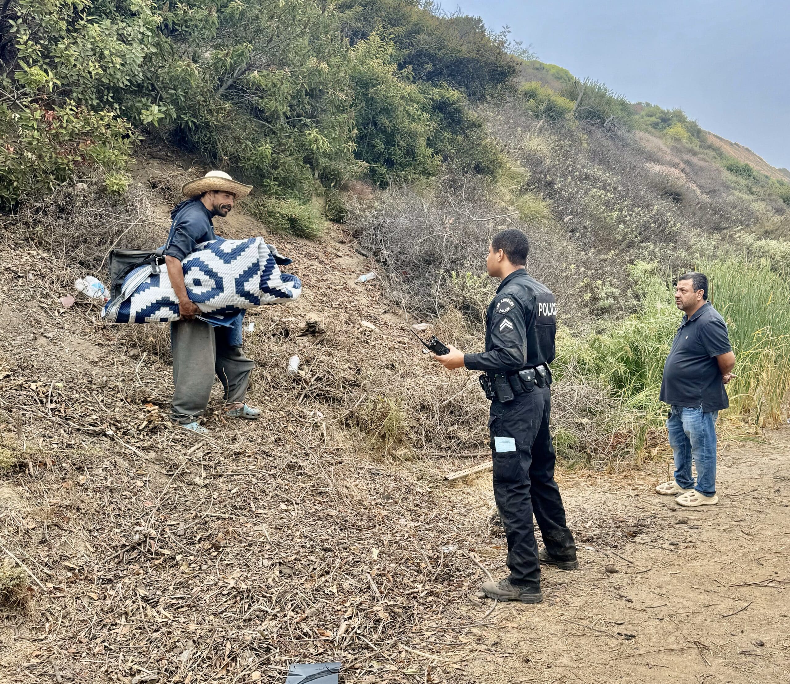 On September 3, three campsites were found below the Corona Del Mar bluffs. An LAPD officer with aid from resident Carlos Rodriquez went behind the wall. One transient was escorted out and Rodriquez cleaned up the trash.