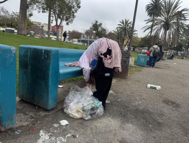 A person bends over a plastic bag of trash beside a MacArthur Park bench, underscoring the day-to-day instability former treatment clients say they face after being cut loose with nowhere to go.