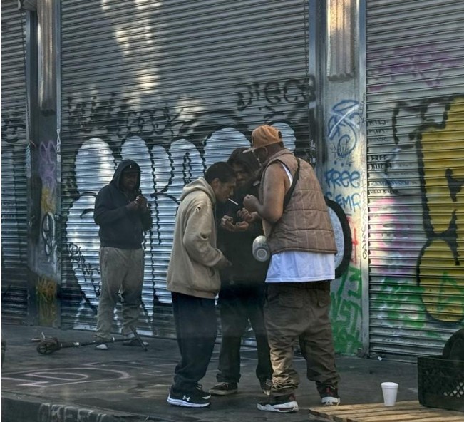 A group huddles on a sidewalk outside shuttered city storefronts, a snapshot of the street-level drug activity Angelenos say has become routine.