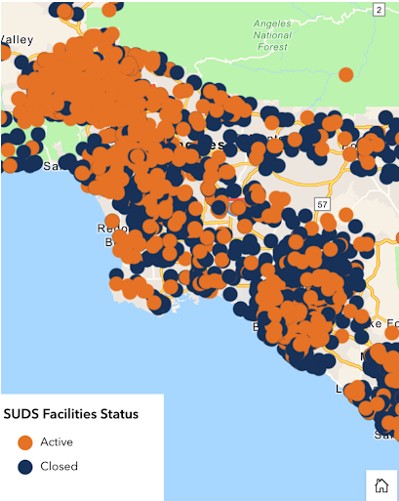 Locations of substance use disorder treatment facilities clustered across Los Angeles, as shown in a county map.
