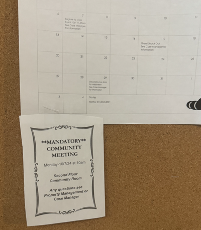 A notice mandating attendance at a voter registration meeting is posted on a building in Skid Row.
