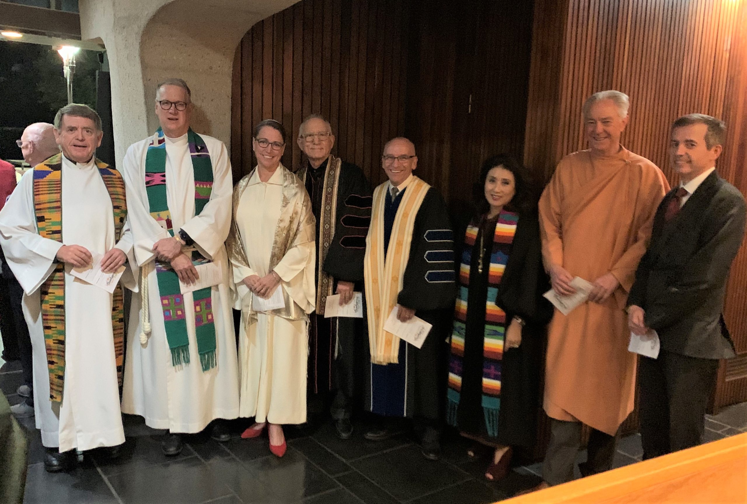 Before the service, clergy members waited to enter the Corpus sanctuary (left to right): Monsignor Liam Kidney, Corpus Christi Catholic Church; Rev. Bruce Freeman, St. Matthew’s Episcopal Church; Rabbi Amy Bernstein, Kehillat Israel; Rabbi Steven Carr (KI), Rev. Wayne Walters, Community United Methodist Church; Rev. Grace Park, Palisades Presbyterian; Brother Satyananda, The Self-Realization Fellowship; and Bishop Matthew Garff, The Church of Jesus Christ of Latter Day Saints.