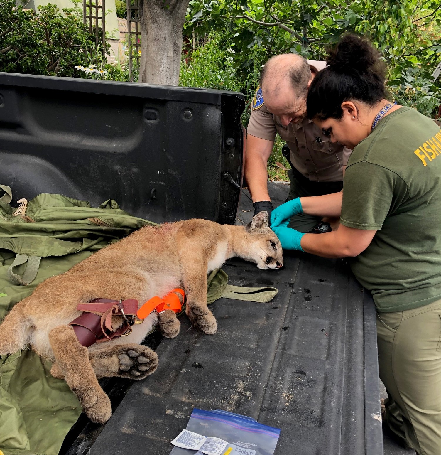The mountain lion which was found in the trees behind Tahitian Terrace. It was tranquilized and is being tagged.