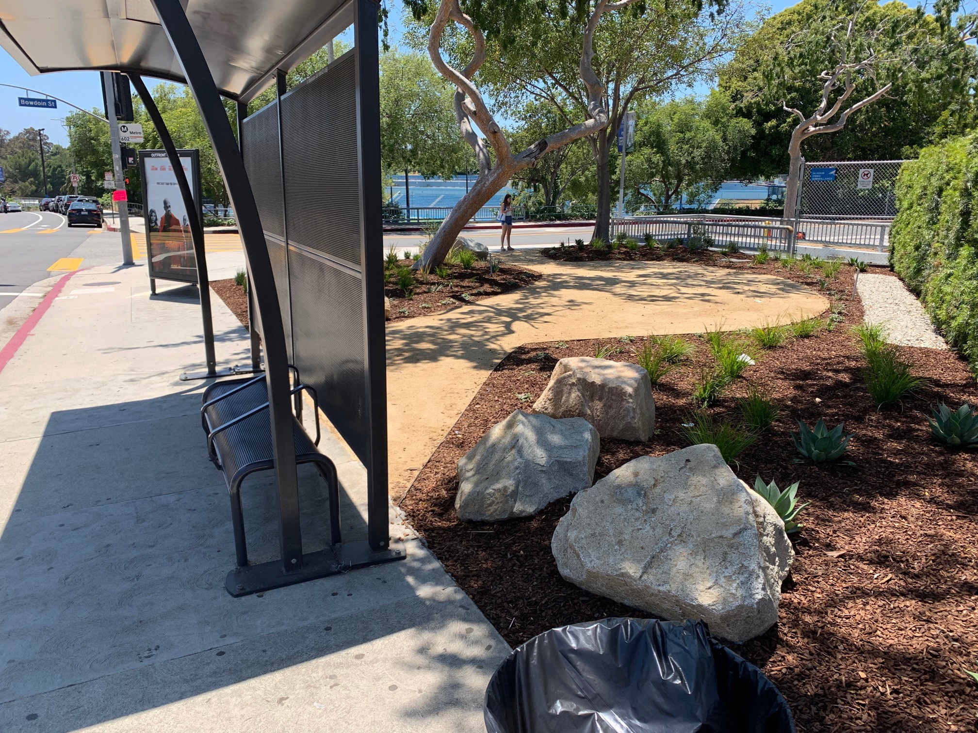 The project stalled when David Riccardi, the Palisades High director of operations, left the school. But five years later, the digital sign is gone, the handball courts have been removed and the area widened. Over the past two weeks, the soil was prepped, and plants were installed. A decomposed granite walkway was installed and will allow kids to cut the corner, meaning they will no longer spill out in the street before and after school.