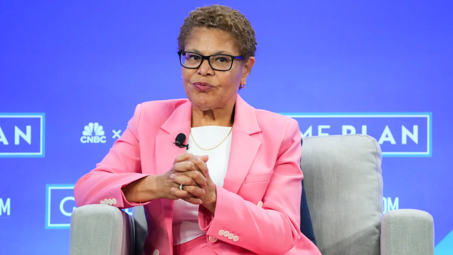 L.A. Mayor Karen Bass speaks onstagge during a panel discussion..