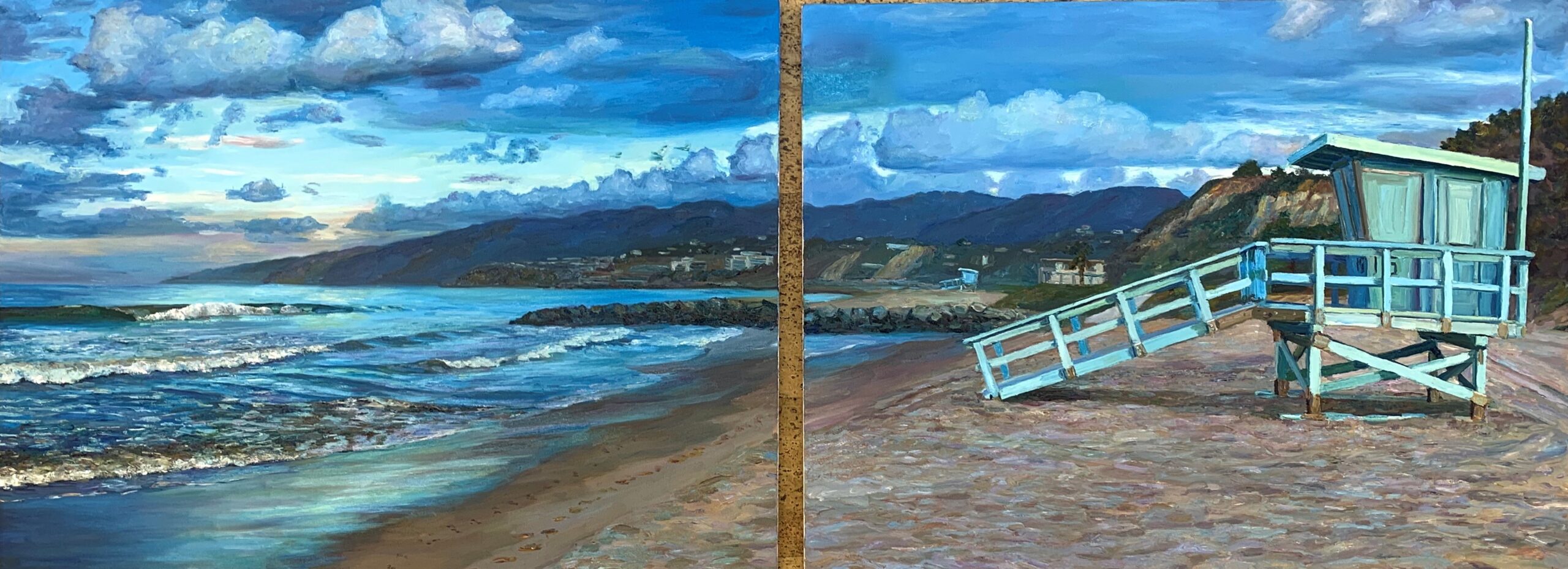 Lately, “I’ve been experimenting with diptychs,” O’Neill said. (A diptych is an artwork consisting of two painted panels.) Below is a piece of art entitled “Clearing Storm.”