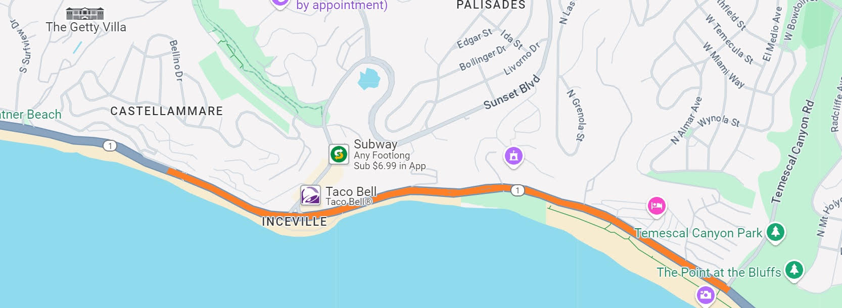 One lane each way will be closed between Temescal Canyon Road and Porta Marino. The closure is necessary to repave two sections of the highway north of Temescal. Lanes will reopen each morning.