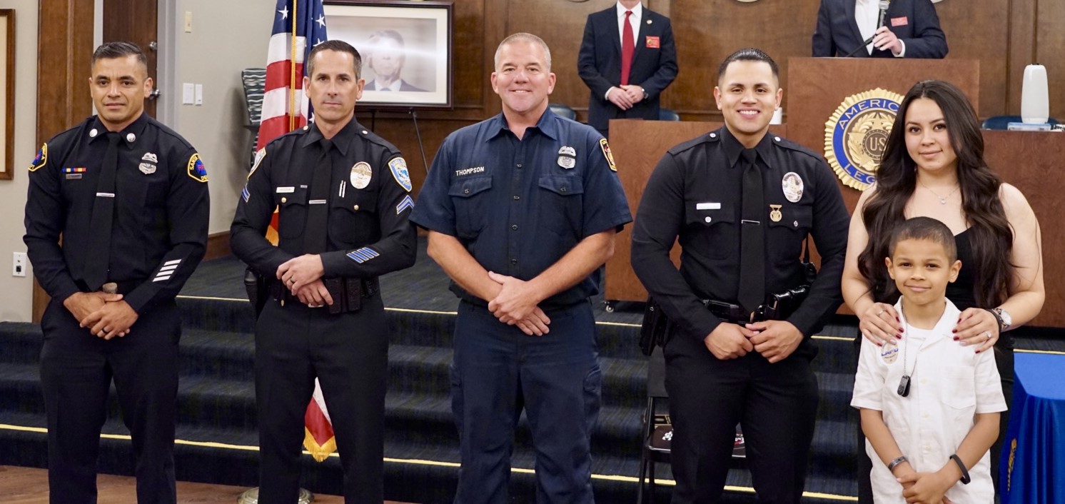Law and Order’s 2024 Class of honorees include (left to right ) SM Fire Captain Eric Nagao, SM Officer David Hodgson, LAFD Station 69 Michael Thompson, LAPD Officer Adrian Perez