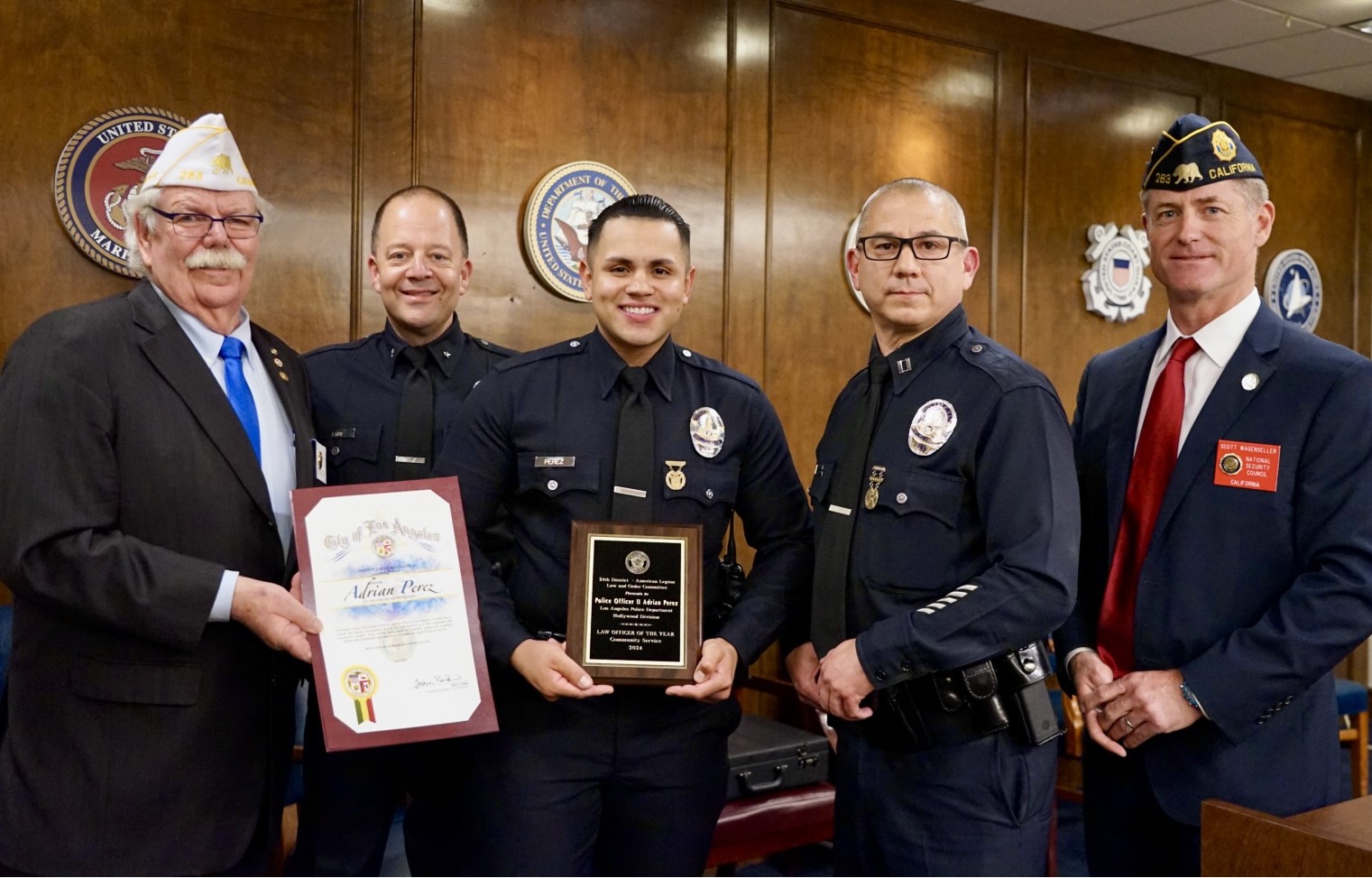 Capt. Craig Heredia (second from right) praised Hollywood’s officer of the year Adrian Perez (center).