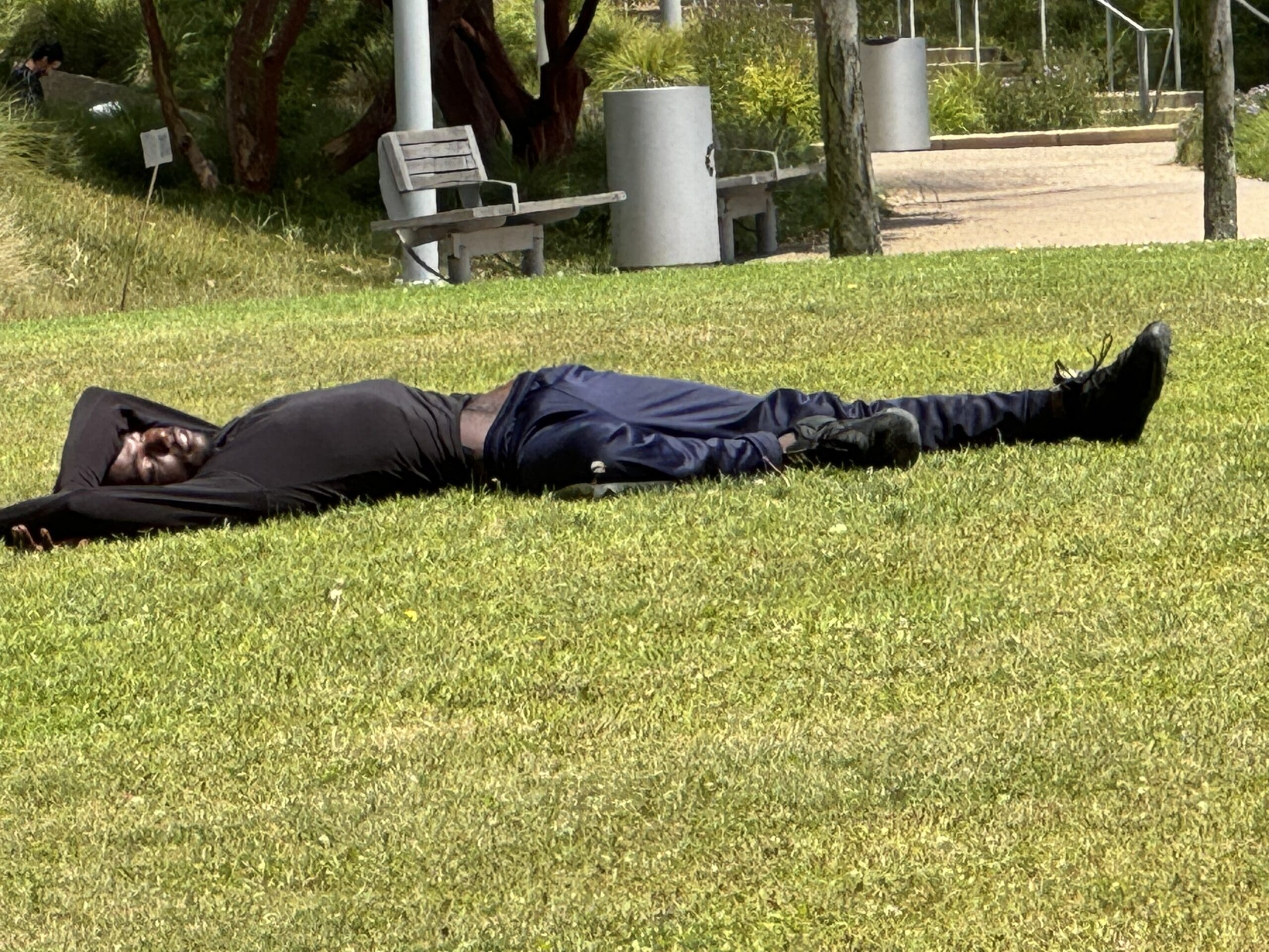 This man was motionless in Tongva Park. It was hard to determine if he was still breathing or whether 911 needed to be called.