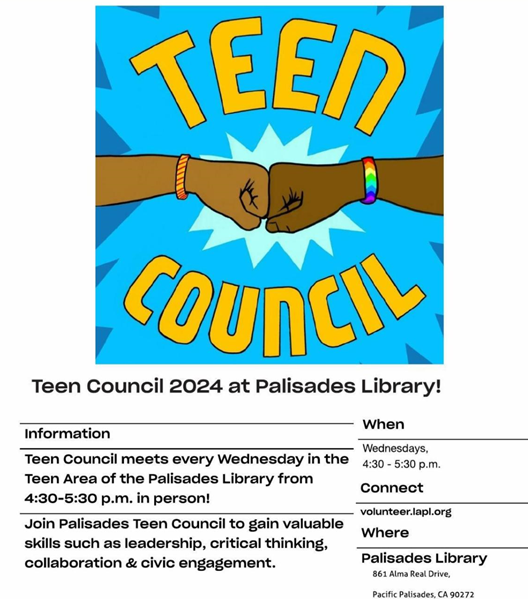About two years ago, I volunteered to help with the refurbishing of the teen area at the Palisades branch library. During these past two years, I have had the pleasure of working with and around Palisades teens. The culmination of the two years was the kickoff of a native pollinator garden, an art exhibit by Pali High art students and the community room filled with photographs from Pali High photography students.