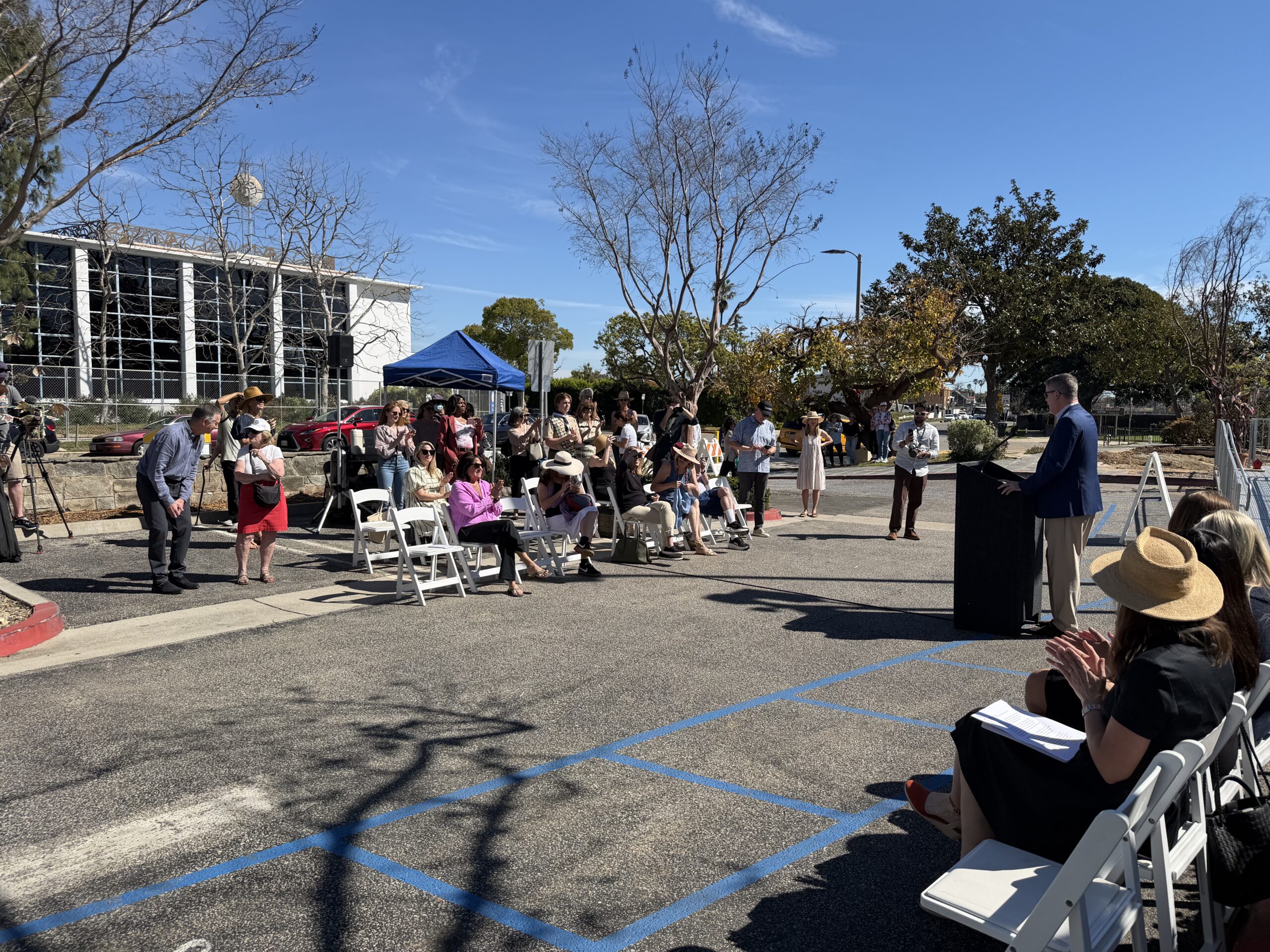 About 30 people gathered on February 27  for the opening of the two portable buildings that had been placed on the Palisades Library parking lot at 861 Alma Real. The public library was one of  7,000 residences/commercial structures and public buildings that burned during the January 2025 Palisades Fire.