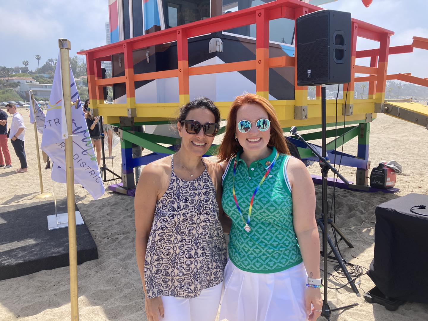 Community Council President Maryam Zar (left) and L.A. County Supervisor Lindsey Horvath at the unveiling of the Lifeguard towers painted in the colors of the Progress Pride Flag.