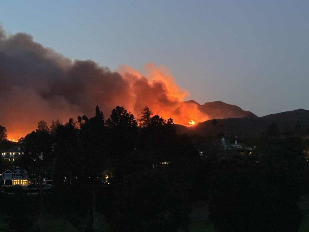 The Palisades Fire at sundown on January 7. The cause of the fire was an earlier fire, the Lachman Fire, that had not been completely put out.