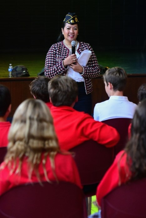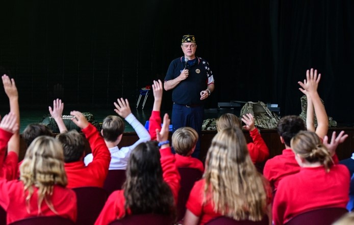 Two local veterans, past Ronald Reagan Post 283 Commander Jim Cragg, and Post member Ranee Rubio, spoke to elementary and middle school students at Corpus Christi on November 9, prior to Veterans Day, which will be held on Monday, November 11.