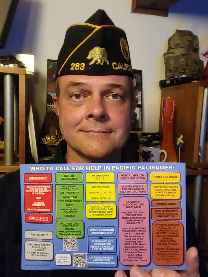 Cragg, through the Legion, hosted briefings by the West LA Division LAPD, LA Sheriff’s Department the Pacific Palisades Task Force on Homelessness, Station 69 LAFD, and an LASD briefing on Active Shooter Response, and invited the community to attend. These town hall meetings were free to the public.
