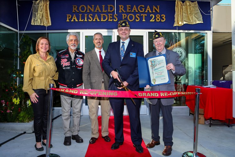 The reopening of the Post after the remodel had several dignitaries (left to right ) Councilmember Traci Park, actor Joe Mantenga, Ronald Reagan Foundation Representative John Lehne, Commander Jim Cragg and Past 283 Commander Eric Measles.