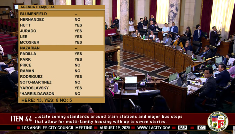The Los Angeles City Council voted 8–5 to oppose Senate Bill 79, the controversial statewide density bill authored by San Francisco Senator Scott Wiener, today August 19.