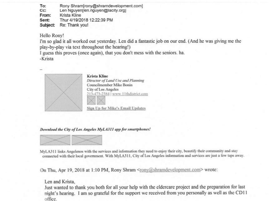 On April 19, Krista Kline (Bonin’s director of land use and planning) sent an email to developer Rony Shram, cc’ing Nguyen.