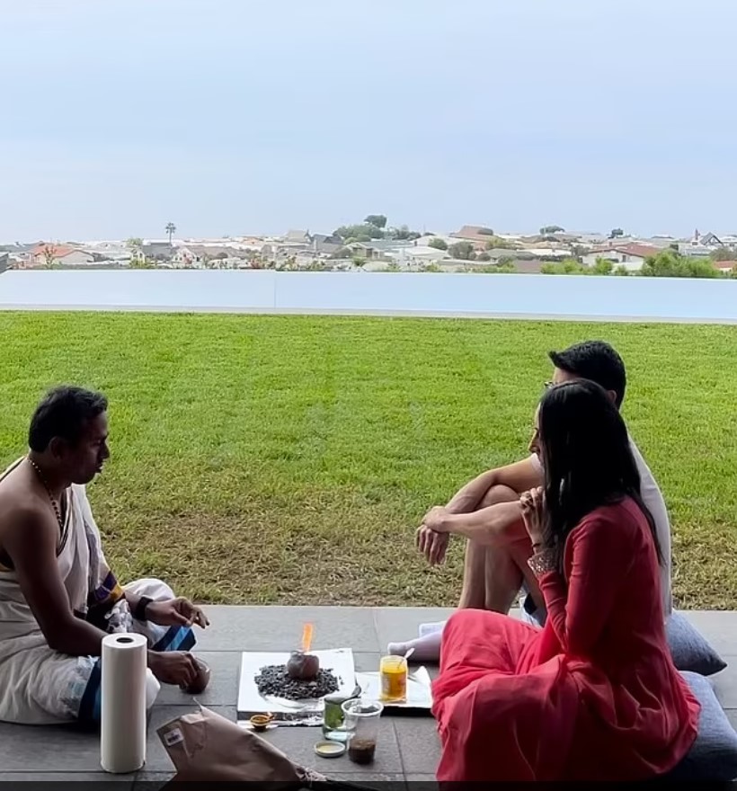 New home owner Anita Verma-Lallian with her Panditji, who gave Perry’s former home a blessing from a deck overlooking the backyard, the pool and the Pacific Ocean.