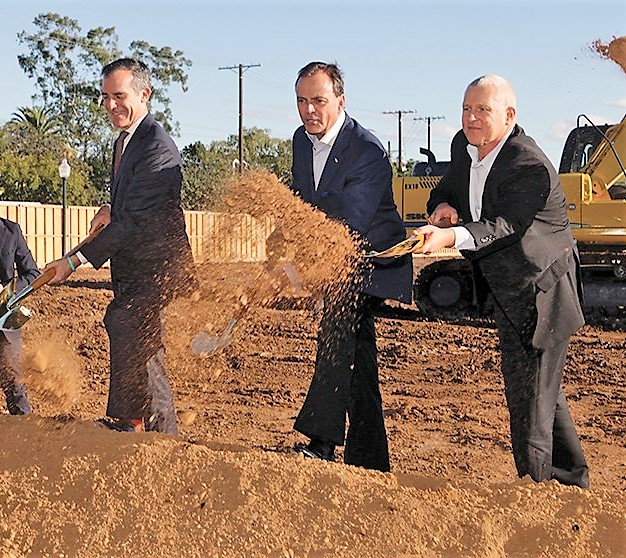 Mayor Eric Garcetti (left) is shown with Rick Caruso (center) and Councilman Mike Councilman Mike Bonin at the groundbreaking for Caruso’s Palisades Village.