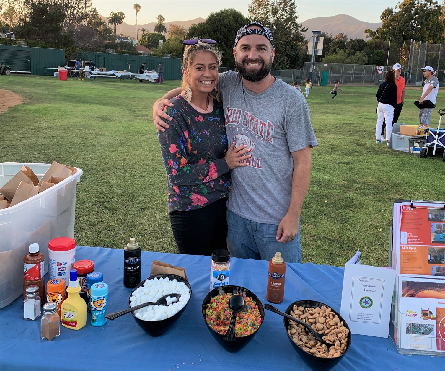 Presbyterian Youth Pastor Hayden Roush and his wife, Village School teacher Heather Holguin manned a free popcorn “bar” at Movies in the Park.
