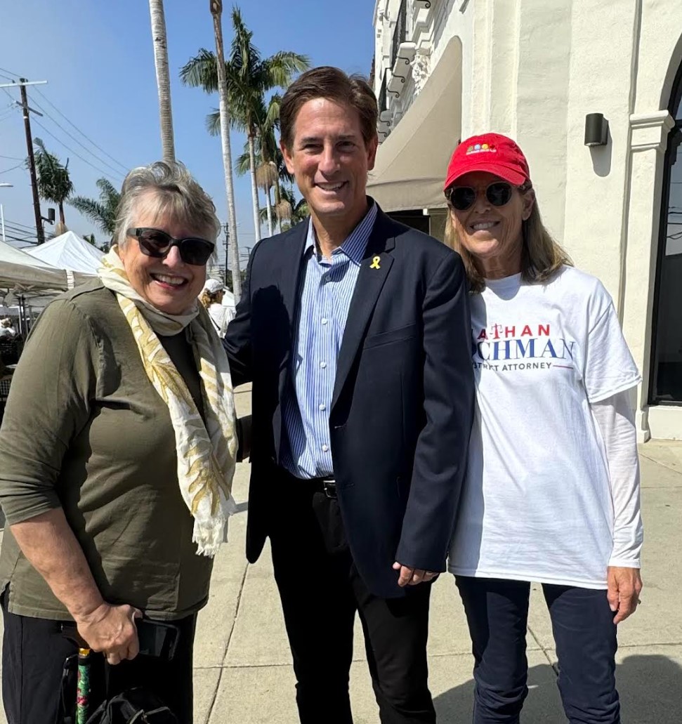 Community Council Member Chris Spitz (left) and Council President Sue Kohl, welcomed Nathan Hochman to the Palisades on Sunday.