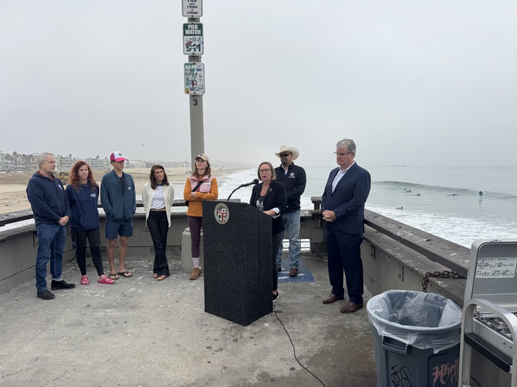 Councilmembers Traci Park (podium) and Tim McOsker were joined by environmental activists and business owners at the Venice Beach Pier.