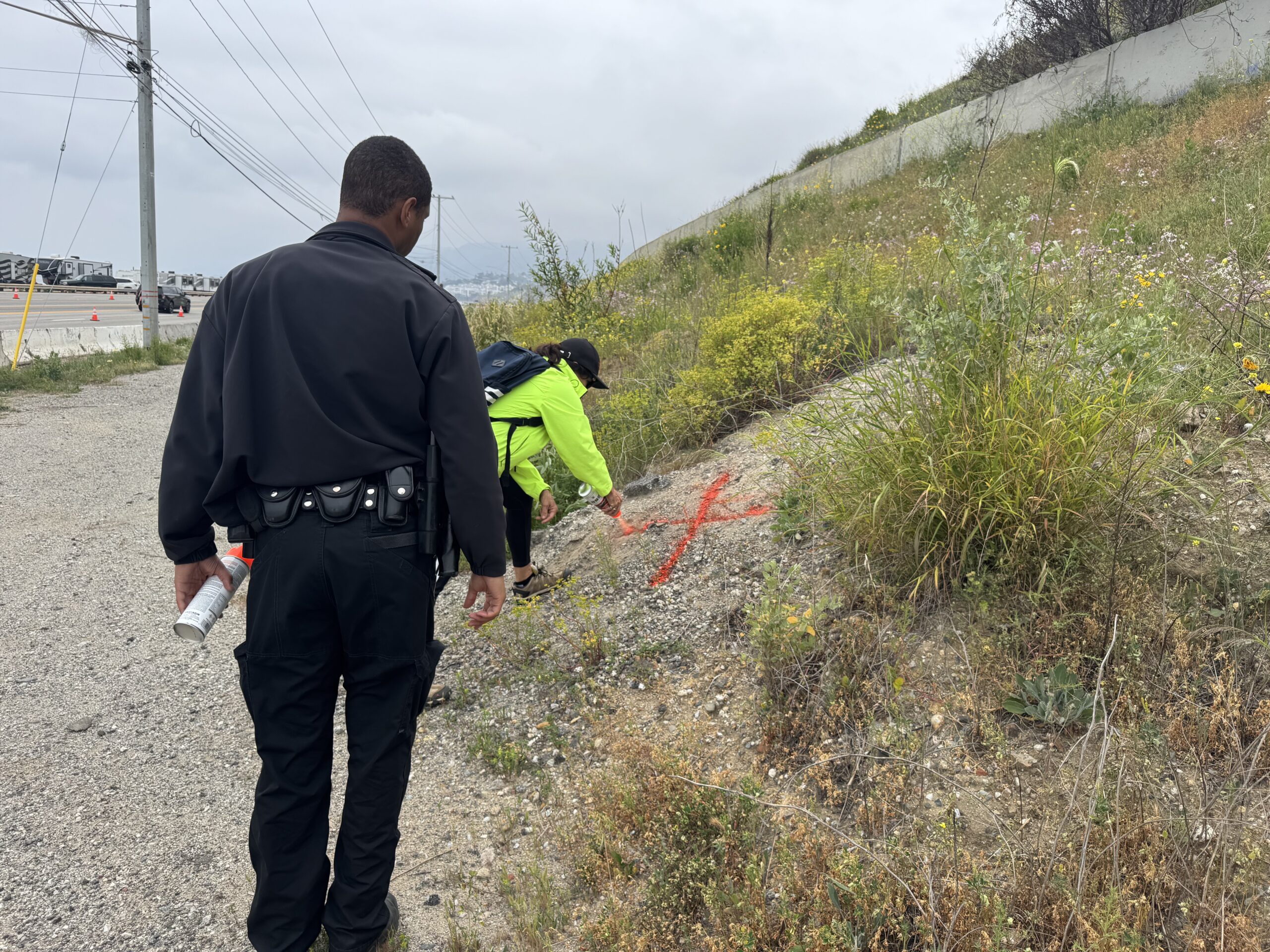 Sharon Kilbride marks a spot where there was a sign before the fire, as a police officer looks on.