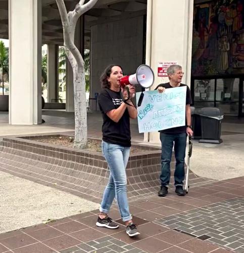 Executive Director Becky Dennison of the nonprofit Venice Community Housing led a protest at City Hall. That groups supports a large development in the Venice canal area, that locals do not support. Photo: Instagram