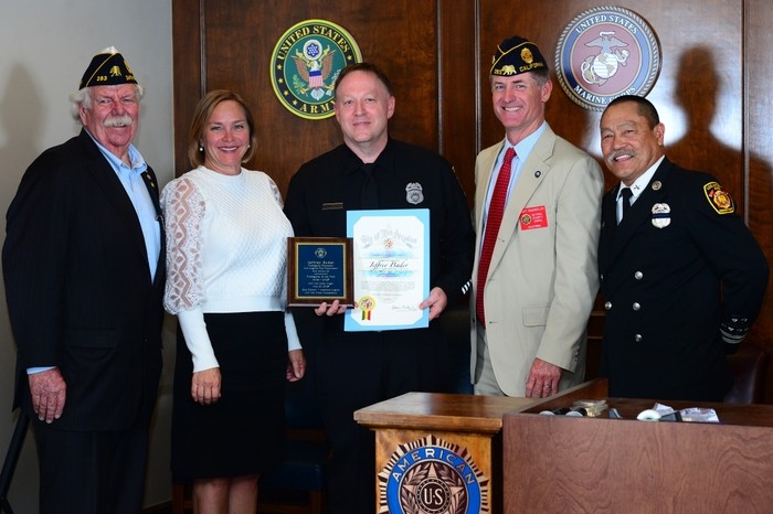 (Left to right) District 24 Commander and Palisades resident Kevin Niles, Councilmember Traci Park, Firefighter/paramedic Nathan Bordofsky, emcee and past commander Scott Wagenseller and Station 69 Captain Thomas Kitahata smile as Bordofsky holds his awards.