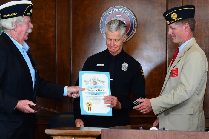 Firefighter Thomas Oberto receives his award from Kevin Niles (left) and Scott Wagenseller (right).