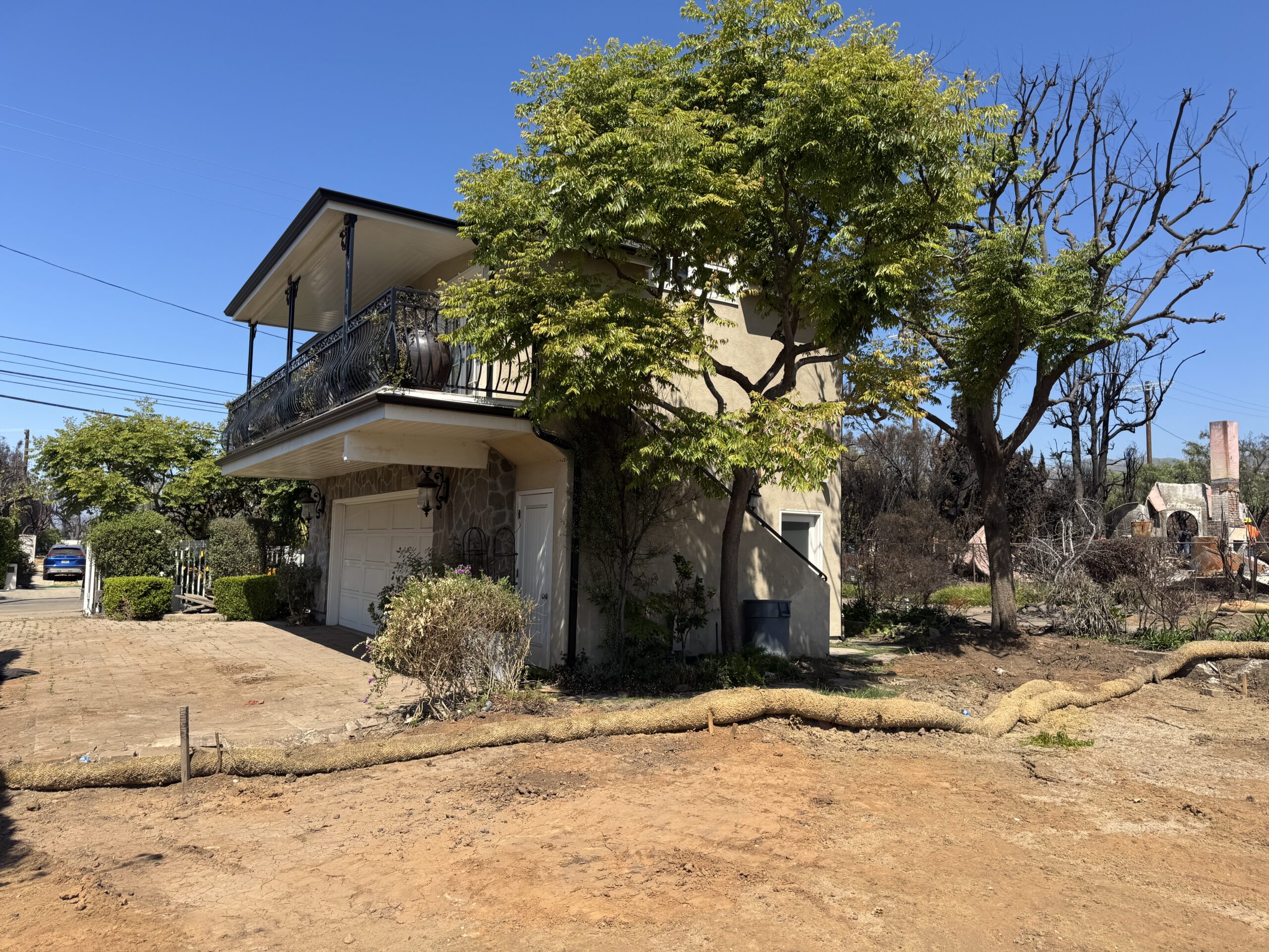 This garage, surrounded by vegetation survived the fire, the home behind it did not.