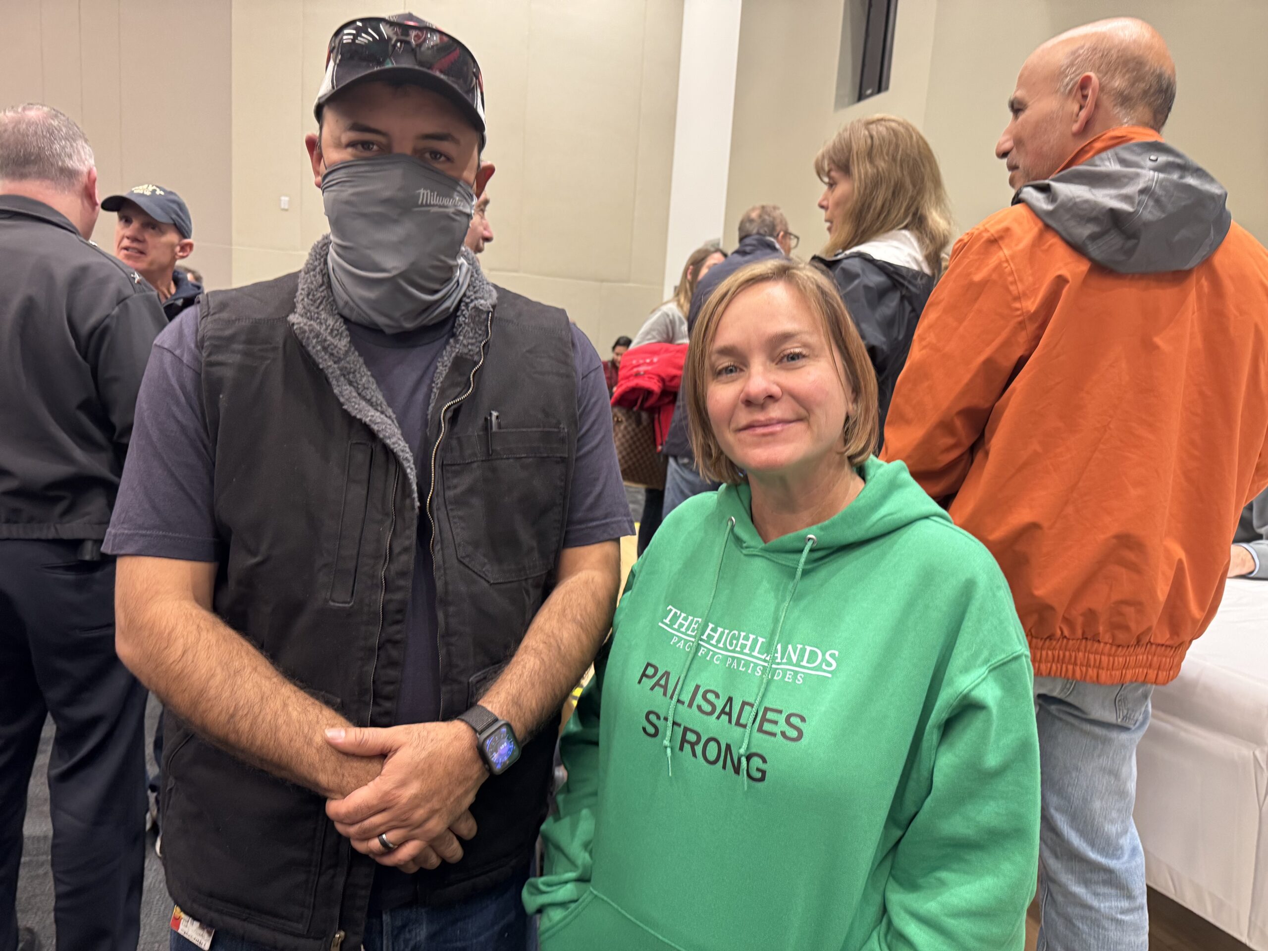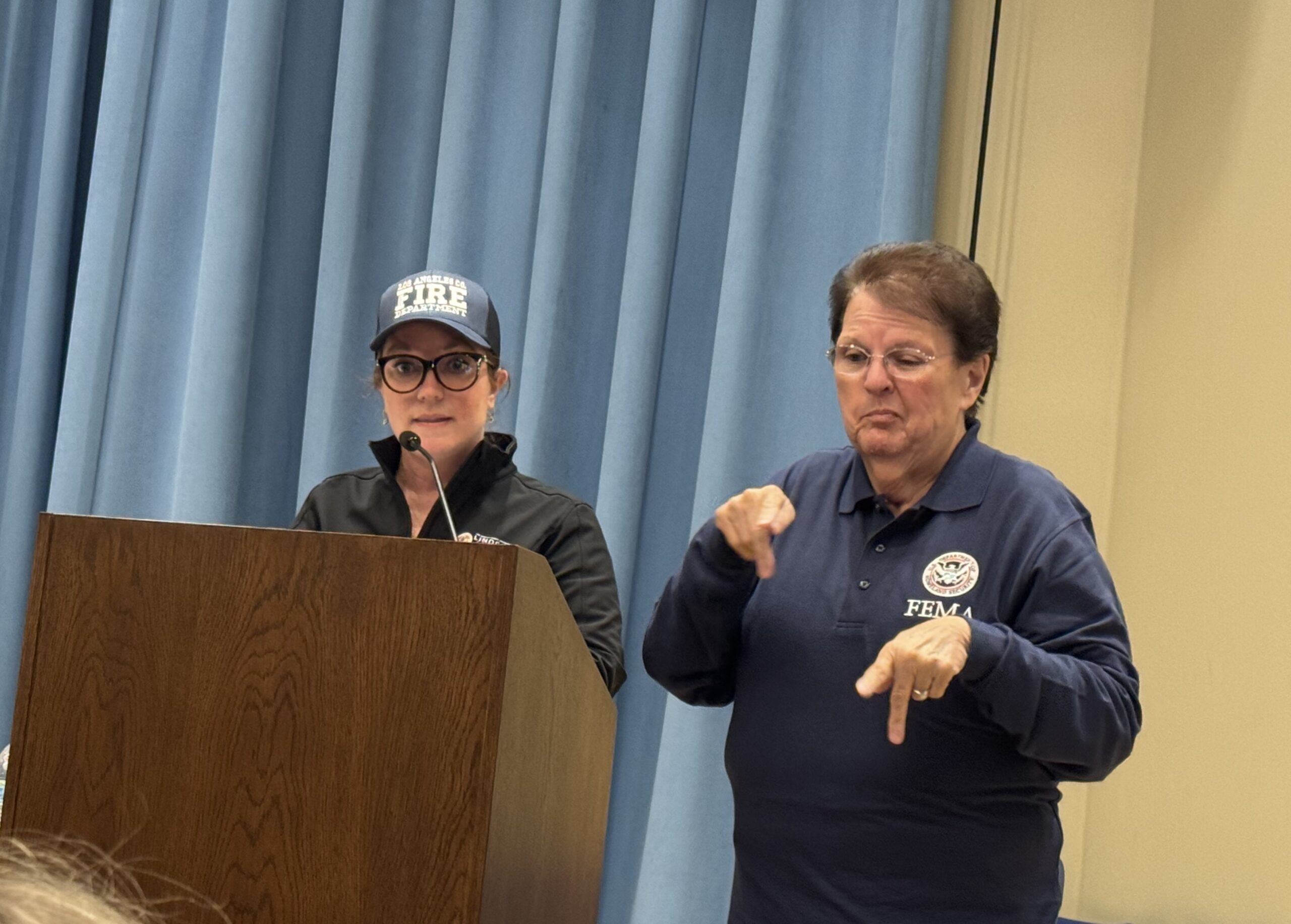 But before any of the questions were read, Horvath, wearing make-up and a L.A. County Fire cap, welcomed us, “We want you to go back to your homes and rebuild your lives.” And added, “Debris is dangerous, please take every precaution.”
