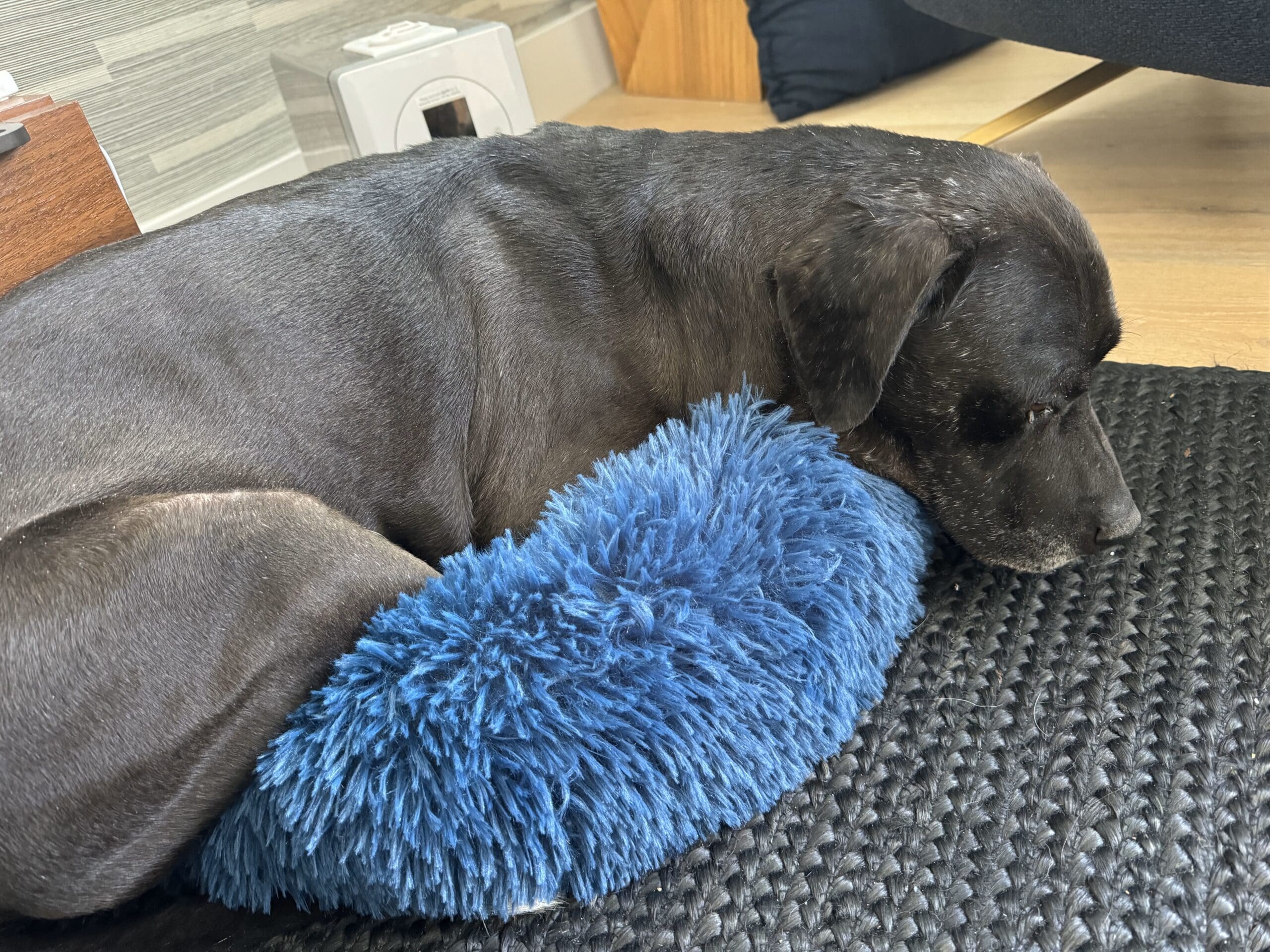 Although she has three small dogs, she brought Perdito, who weighed 50 pounds, home. Initially, the seven-year-old canine needed to be carried down the steps: he walked with difficulty. He had a limp. She took him to a vet, who said he had arthritis and that he should be on bed rest temporarily.