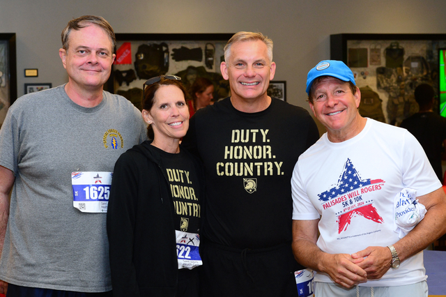 After the race, (left to right) former American legion Post 283 Commander Jim Cragg, Betsy and Lt. General Steve Gilland and Steve Guttenberg met at the Legion.