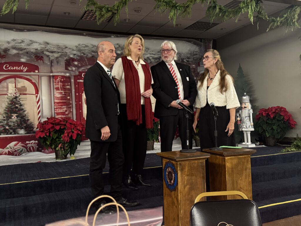 Seniors were treated to an unusual barbershop quartet –two married couples– generally quartets are all male. Participants were invited to sing along on “The Twelve Days of Christmas,” and everyone did their best to warble in tune.