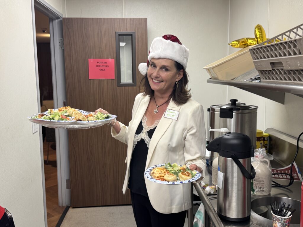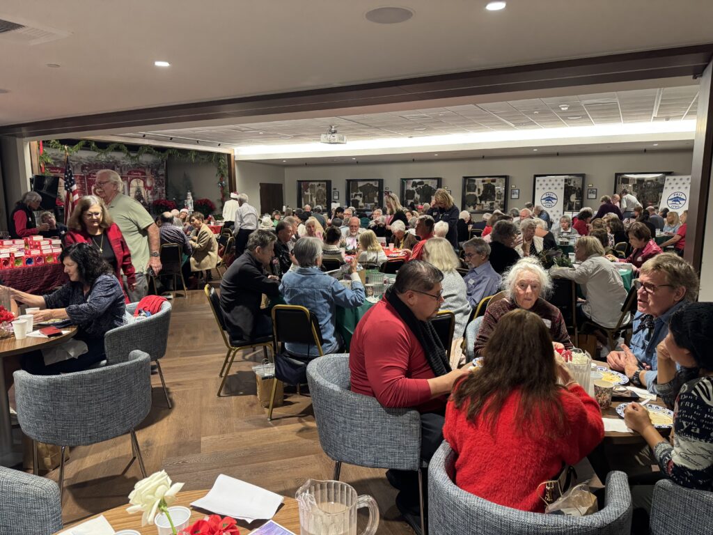 The Palisades Long-Term Recovery Group (PLTG) hosted a festive luncheon today, December 16 at the American Legion for the town’s seniors. Food was catered by Vittorios and the delicious little garlic “knob” rolls, lasagna and Caesar Salad were much appreciated. The about 150 guests had a choice for desert of either apple, pumpkin or pecan pie.