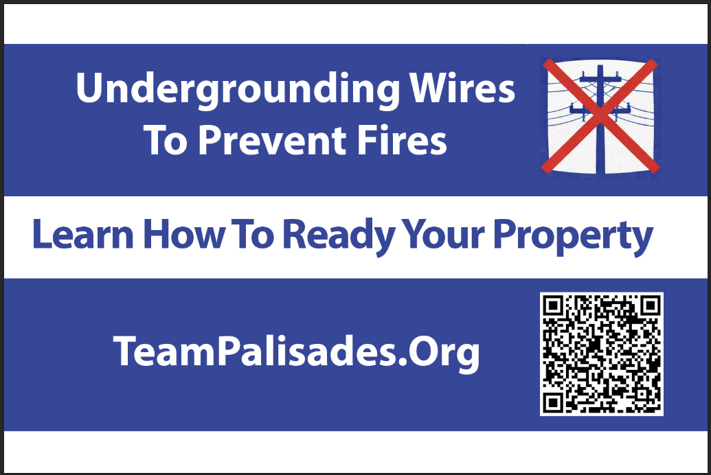 Team Palisades and the PPCC have produced a sign. A physical, corrugated-plastic sign, to be installed in your parkway, expressing community support for undergrounding. Democracy, rendered in lawn signage, 24 by 18 inches, visible from the street…