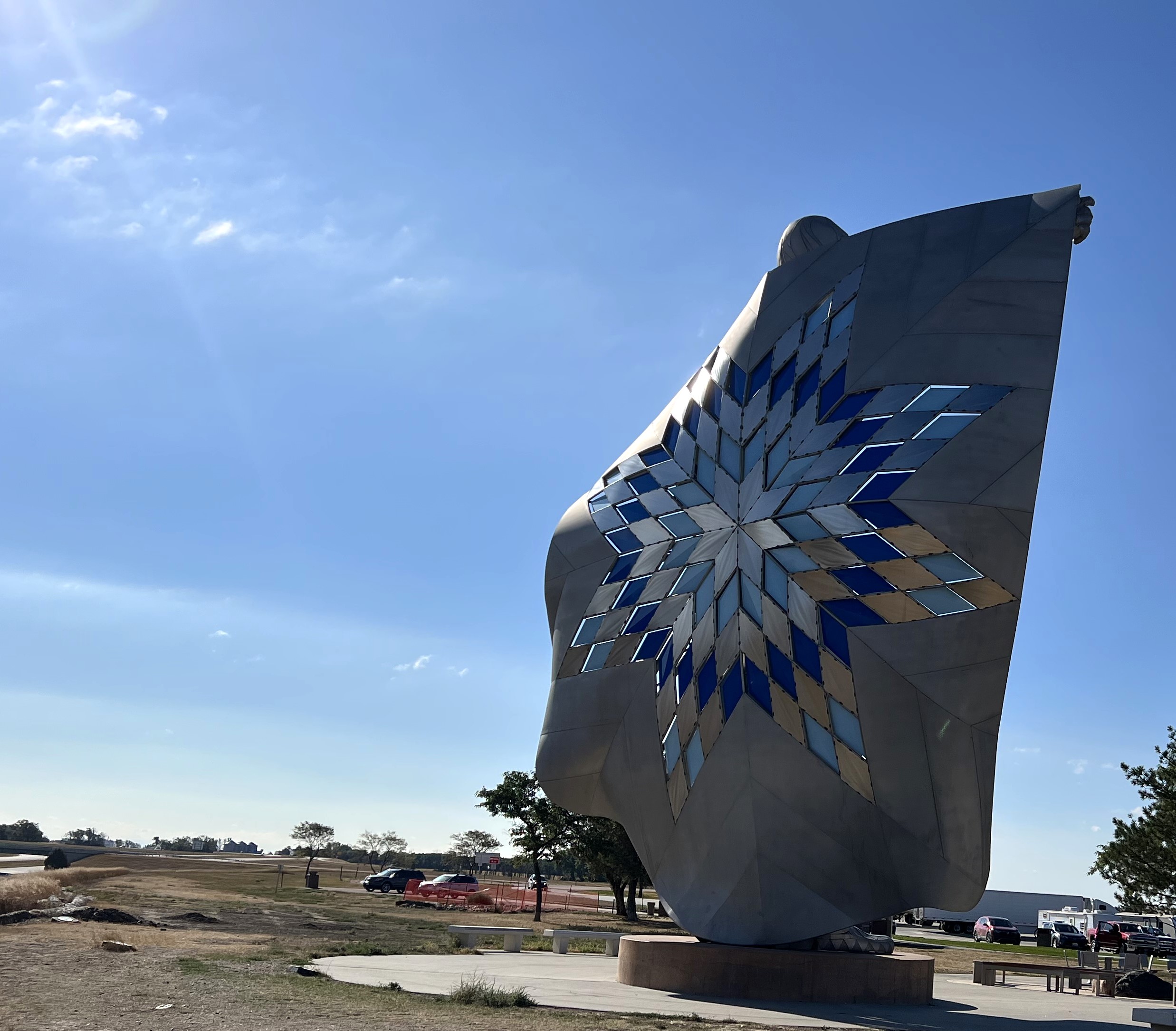The statue was erected in 2016, off Interstate 90, where it overlooks the Missouri River. The sculpture features a star quilt. Automotive paint expert Brook Loobey assisted with the colors for the quilt, and Albertson Engineering of Rapid City ensured the sculpture would endure the strong winds common in the area. This editor was able to see it when she attended the Master Gardener’s convention with her mother in 2021.