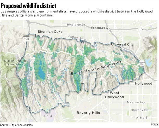 “The ordinance includes regulations that apply to all properties within the Wildlife District, as well as additional regulations that apply to lots where natural resources, such as water features, open space, or ridgelines, are present,” Spitz said. “The Wildlife District proposal includes a code amendment to create a new Wildlife Supplemental Use District (WLD) and a zone change to apply the regulations to the zoning of properties located in the WLD District, approximately between the 405 and 101 freeways, and Ventura and Sunset Boulevards.