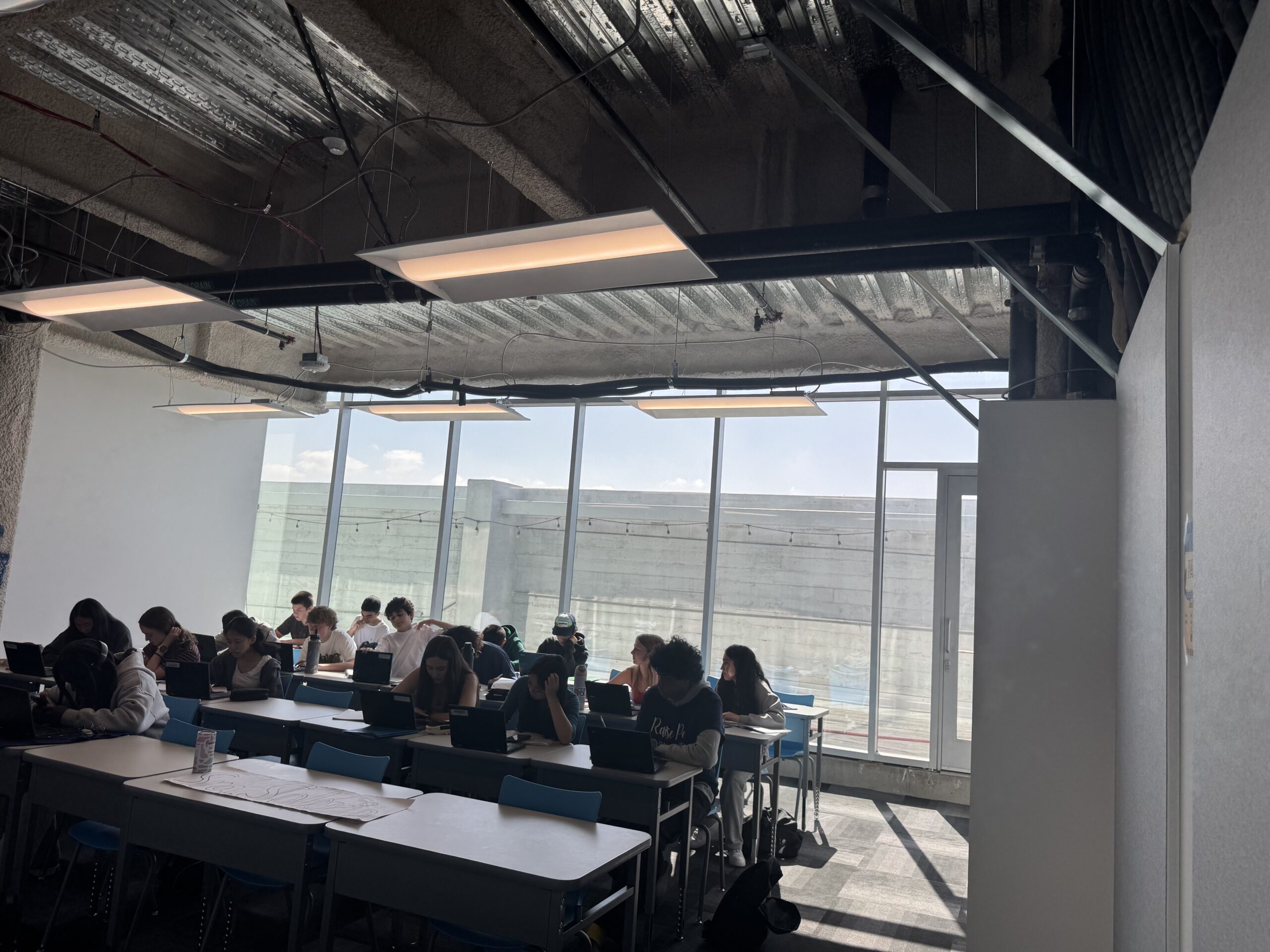 Light pours in through the windows on classrooms in the upper floors.