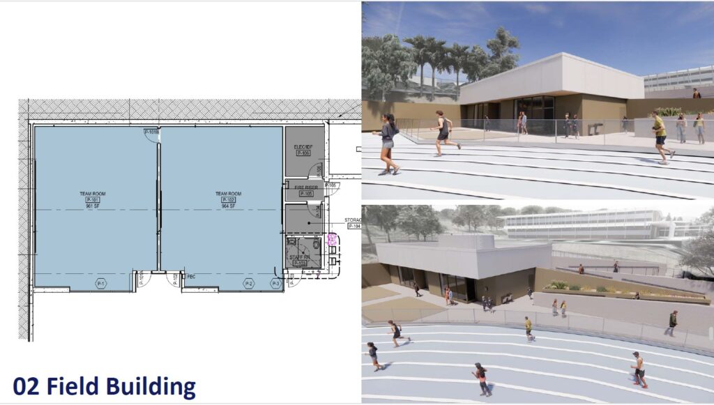 After building construction is completed, the baseball field will be rebuilt. Along the current track, two modular buildings, which stored weight/athletic gear and served as rooms for teams, melted and will be replaced with new buildings.