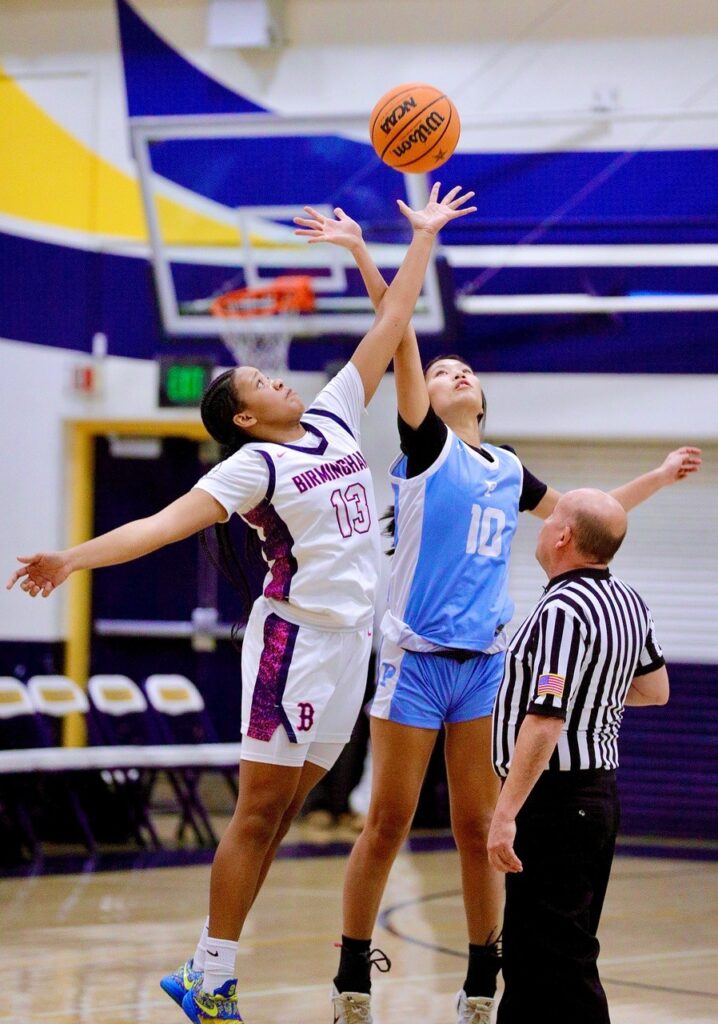 Palisades’ Riley Oku (right) in the opening tip-off against Birmingham’s Jaydin-Lynn Walker.