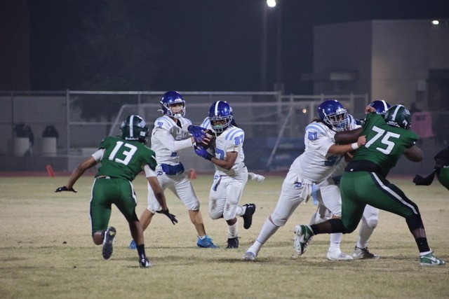 Quarterback Jack Thomas hands the ball to his running back Deveron Kearny. Walter Perez-Webster provides a block.