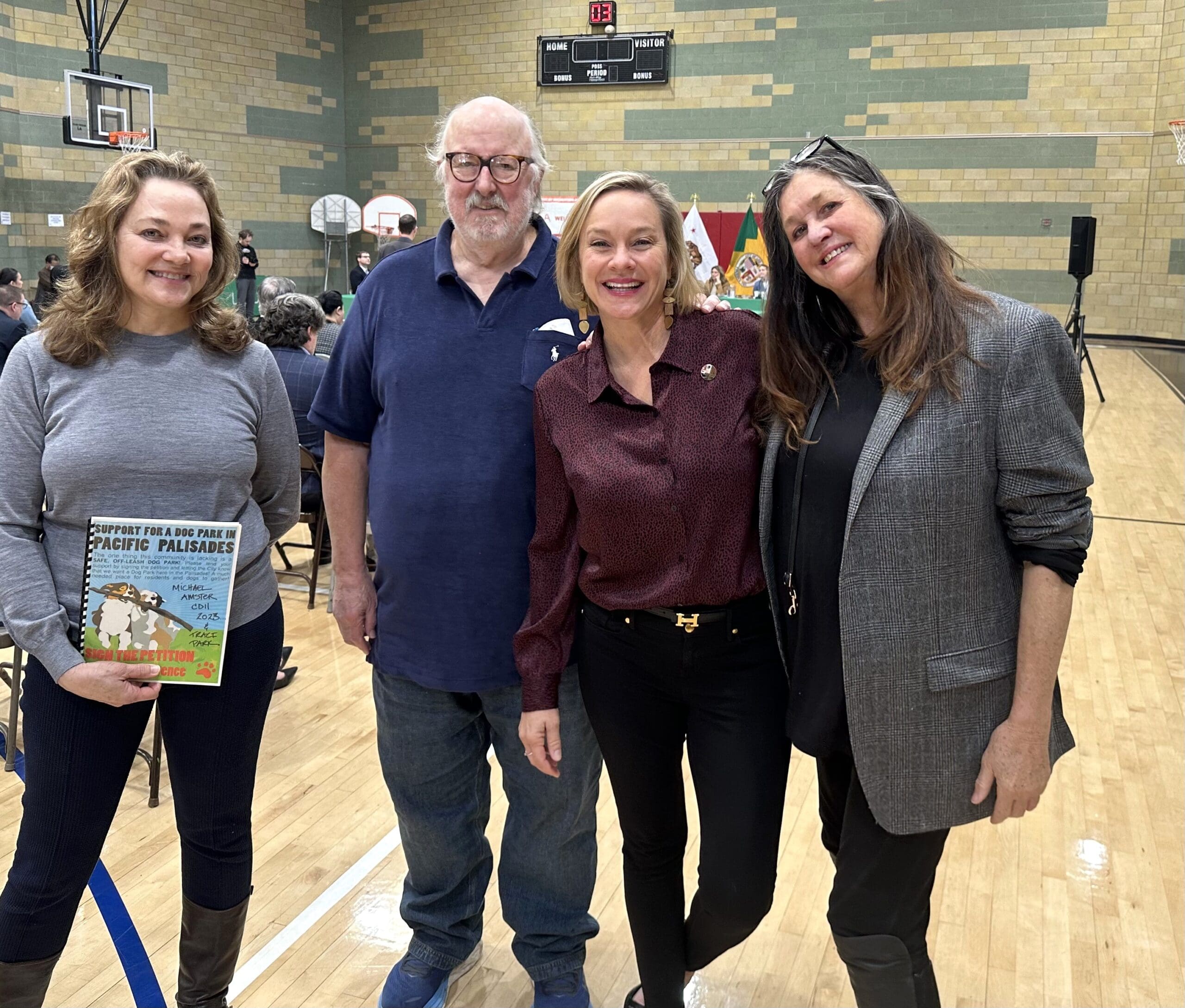 Speaking at the L.A. Board of Rec and Park Commissioners in favor of funding a dog park were (left to right) Lynn Miller, David Card, Councilmember Traci Park and Leslie Campbell.