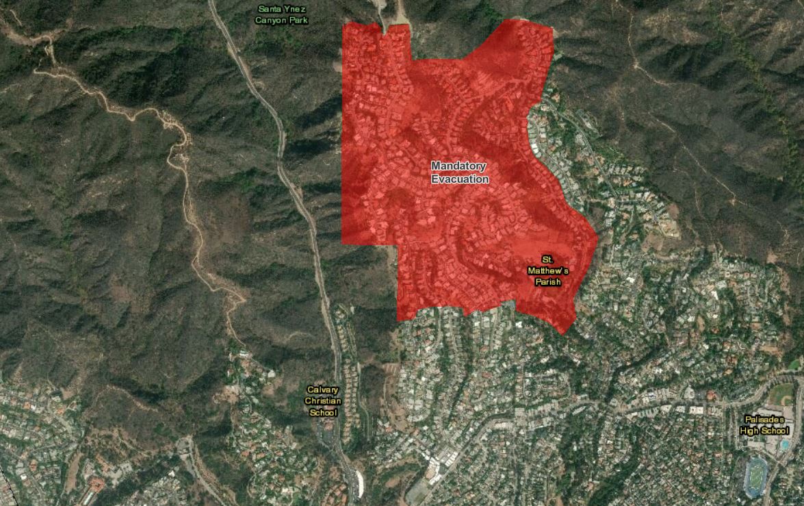 LAFD Captain Brandon Silverman said a mandatory evacuation took effect at 12:35 p.m. for upper Marquez. The area, which contains about 200 houses, was bordered by Charmel to the west, Bienveneda to the east, Merivale to the south and the end of Lachman and Charmel to the north.