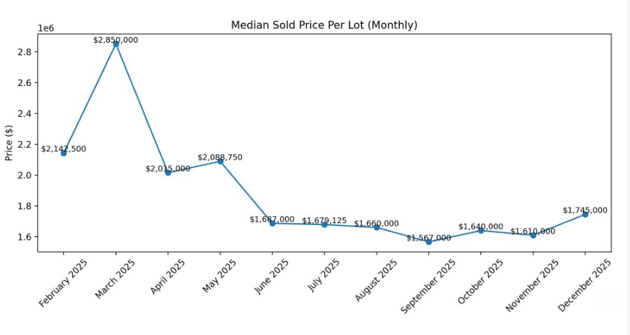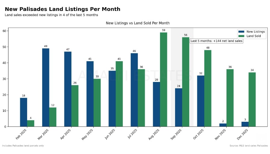 “Land is the clearest leading indicator, and it is already telling us we are in the recovery cycle,” Marguleas said. From February through December 2025, 382 lots were sold. There are 147 active lots, 28 lots in escrow. Land sales have outpaced new listings in four of the last five months. Click here to see the lots sold: click here.