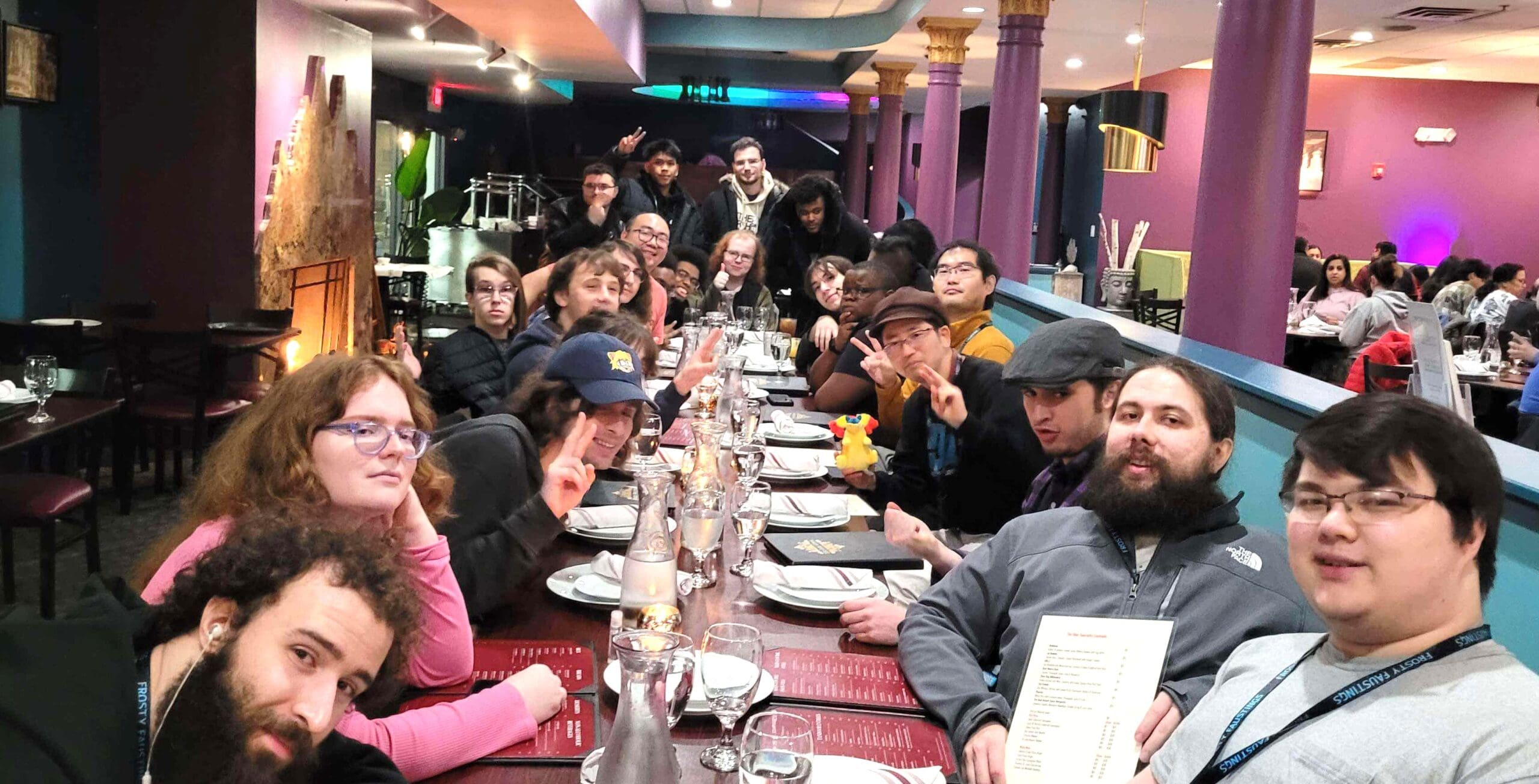 Tournament players taking time for dinner. Top Japanese gamer Nekoze in a brown hat (right), holding up a peace sign is across from the writer. Another Japanese star, Shiita is behind Nekoze.